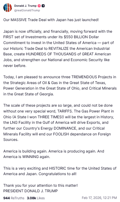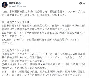 就在美国总统川普宣布“我们与日本达成的重大贸易协议现已正式启动!”不久,日本高市首相发文写道, “日本和美国现已就战略投资计划下的第一批项目达成协议,该协议是在日美关税磋商的基础上达成的。 日本和美国都高度依赖某些国家。本项目涉及生产用于汽车、飞机和半导体零部件加工的工业合成钻石。 为应对全球能源需求增长,美国原油出口基础设施项目正在建设