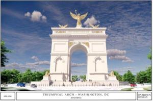 川普日前公布在首都华府兴建一座全新凯旋门的计划,引发外界关注。根据10日发布的设计方案,该纪念建筑将采用华丽风格,顶部设有一尊高耸的带翼雕像,手持类似自由女神的火炬与皇冠,两侧有雄鹰环绕,并由四只狮子守护,整体外观以镀金呈现。美国美术委员会(U.S. Commission on Fine Arts)公布的12页规划文件显示,这座凯旋门自基座至雕像火炬顶端高度约250呎。建筑两侧将以金色字样刻上“O