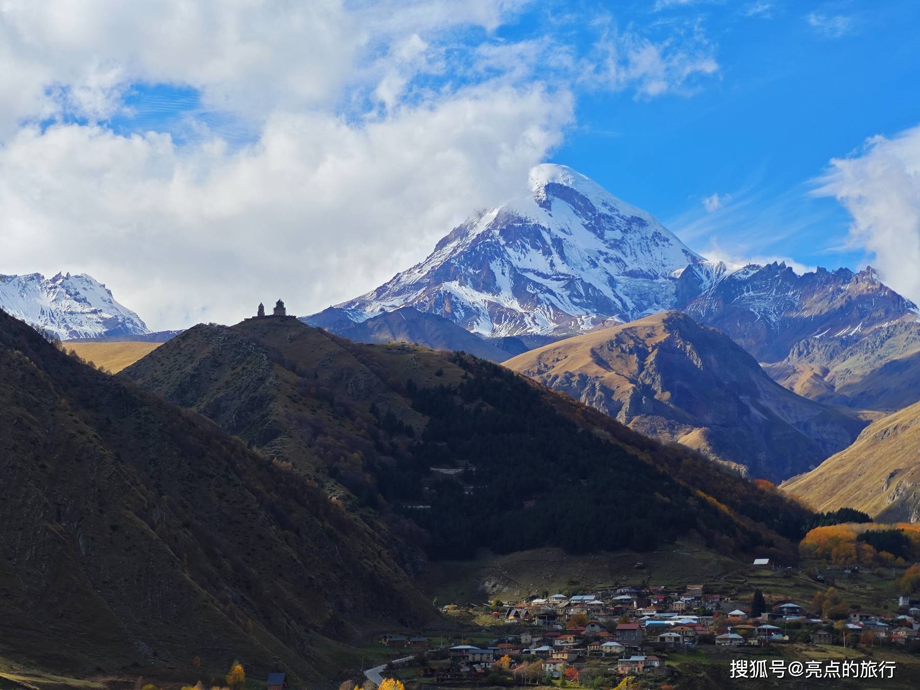 卡兹别克山(海拔5033米)是格鲁吉亚第三高峰,希腊传说中普罗米修斯被囚禁之地。传说中,普罗米修斯被锁链缚在高加索山脉的一块岩石上。一只饥饿的鹰天天来啄食他的肝脏,而他的肝脏又总是重新长出来,他的痛苦要持续三万年。卡兹别克圣三一教堂(Gergeti Trinity Church)孤独地矗立在卡兹别克山腰,以绝佳的位置和震撼的景色吸引了无数旅行者。山下的斯特潘茨明达小镇,可以入住面朝雪山的民宿,品尝