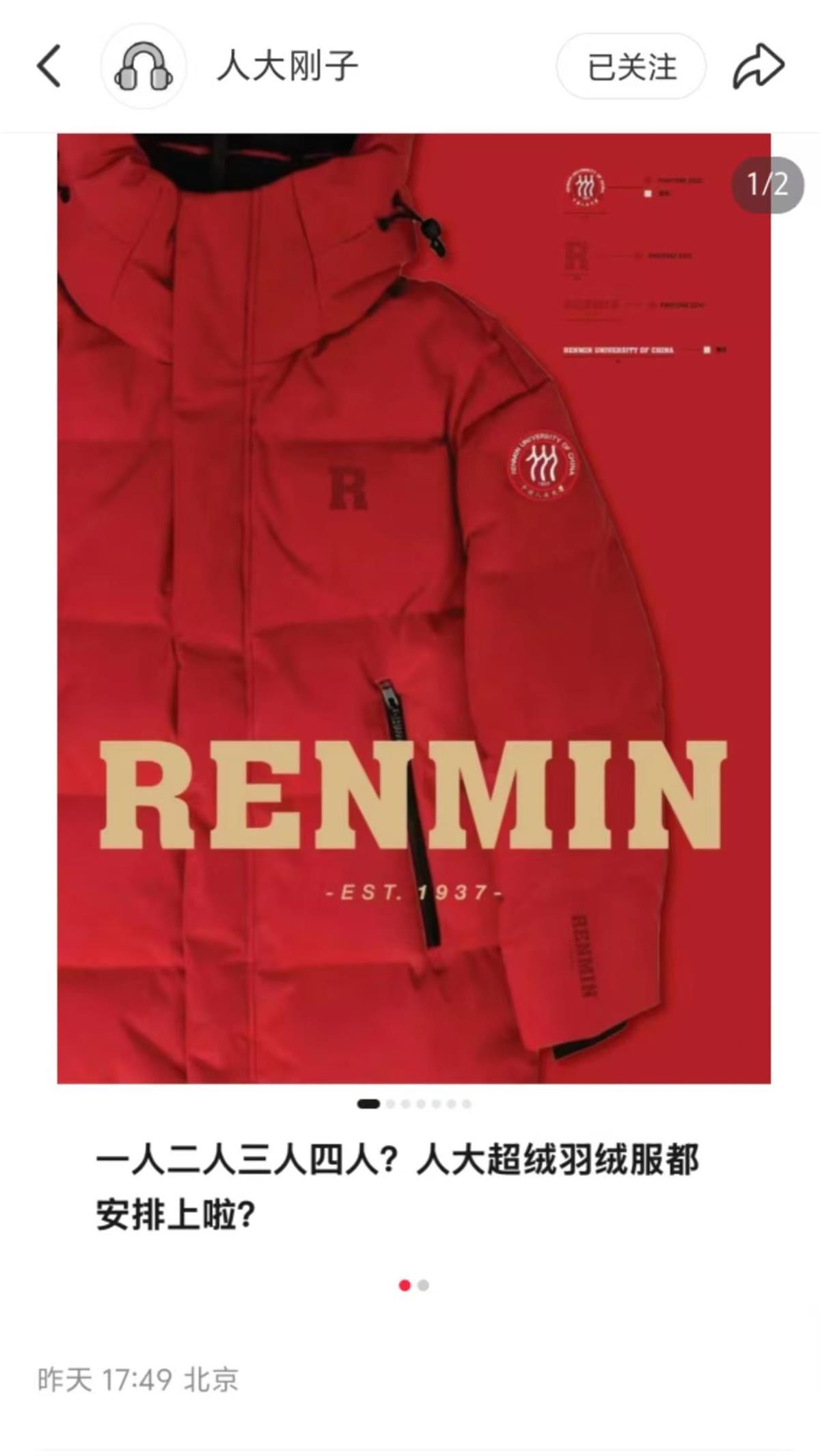 近日,中国多所高校定制羽绒服线上热销。12月10日,中国人民大学党委书记张东刚在社交平台上发帖推荐该校近期上新的人大超绒羽绒服。不少网友在评论区留言求购,“书记能送我一件羽绒服吗”。11日,人大红创中心的一名工作人员告诉记者,羽绒服最近两天上新,销量很不错,还有几款卖断码,“可能书记看到了觉得很有意思就推荐了。”据中国人民大学党委书记张东刚使用“人大刚子”账号发帖,内容为两张图,第一张为学校红色超
